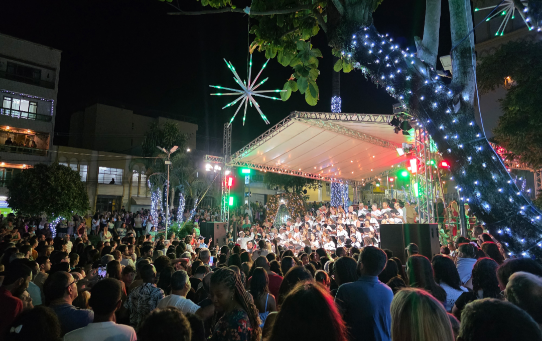 A Praça Cesário Alvim, no Centro da cidade, sediou uma Cantata de Natal que marcou a inauguração da decoração que ilumina a terra do Pai da Aviação, na Zona da Mata mineira